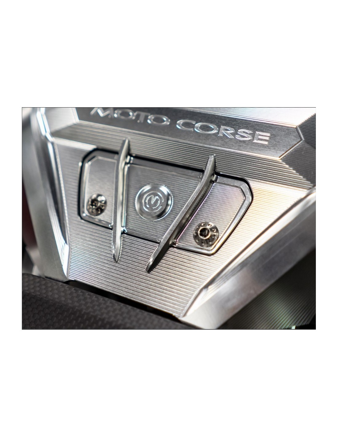 Viene fornita completa di due viti in Titanio realizzate anch'esse tramite macchine a controllo numerico e caratterizzata dal Drilled Billet Titanium, marchio distintivo della Motocorse, ricavato sulla superficie bombata..