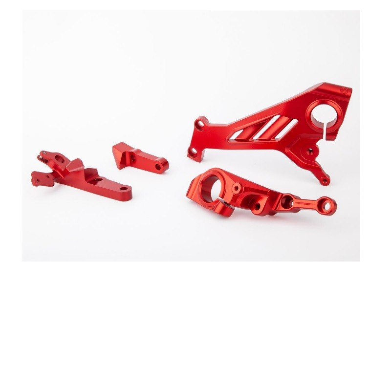 La piastra telaio laterale destra è replica fedele della piastra laterale di serie, mentre la piastra telaio laterale sinistra Motocorse è composta da due parti; una parte superiore dove si fissa la pedana pilota e da una parte inferiore dove normalmente si fissa la stampella laterale di stazionamento. Nel kit Motocorse sono comprese due versioni di quest'ultima parte inferiore: una che prevede il fissaggio della stampella laterale e l'altra che non lo prevede. Quest'ultima variante permette, a chi volesse utilizzare il motoveicolo in pista e montare carene racing, di eliminare sia la stampella laterale che tutta la parte dove la stampella viene fissata, apportando un significativo risparmio di peso.