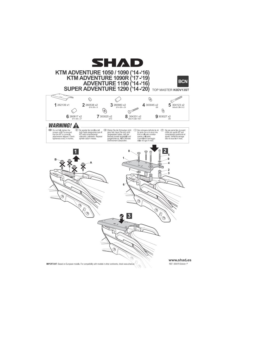 Il kit di fissaggio SHAD Top Master permette di montare il bauletto superiore alla moto. Si tratta di un sistema disegnato appositamente per ogni modello di moto, in base alle caratteristiche proprie del veicolo. Il risultato è un prodotto di alta qualità, comodo e sicuro, facile da montare e smontare. Per il montaggio del bauletto alla moto è necessario utilizzare la piastra inclusa nel bauletto SHAD. (Ad eccezione dei bauletti TERRA).