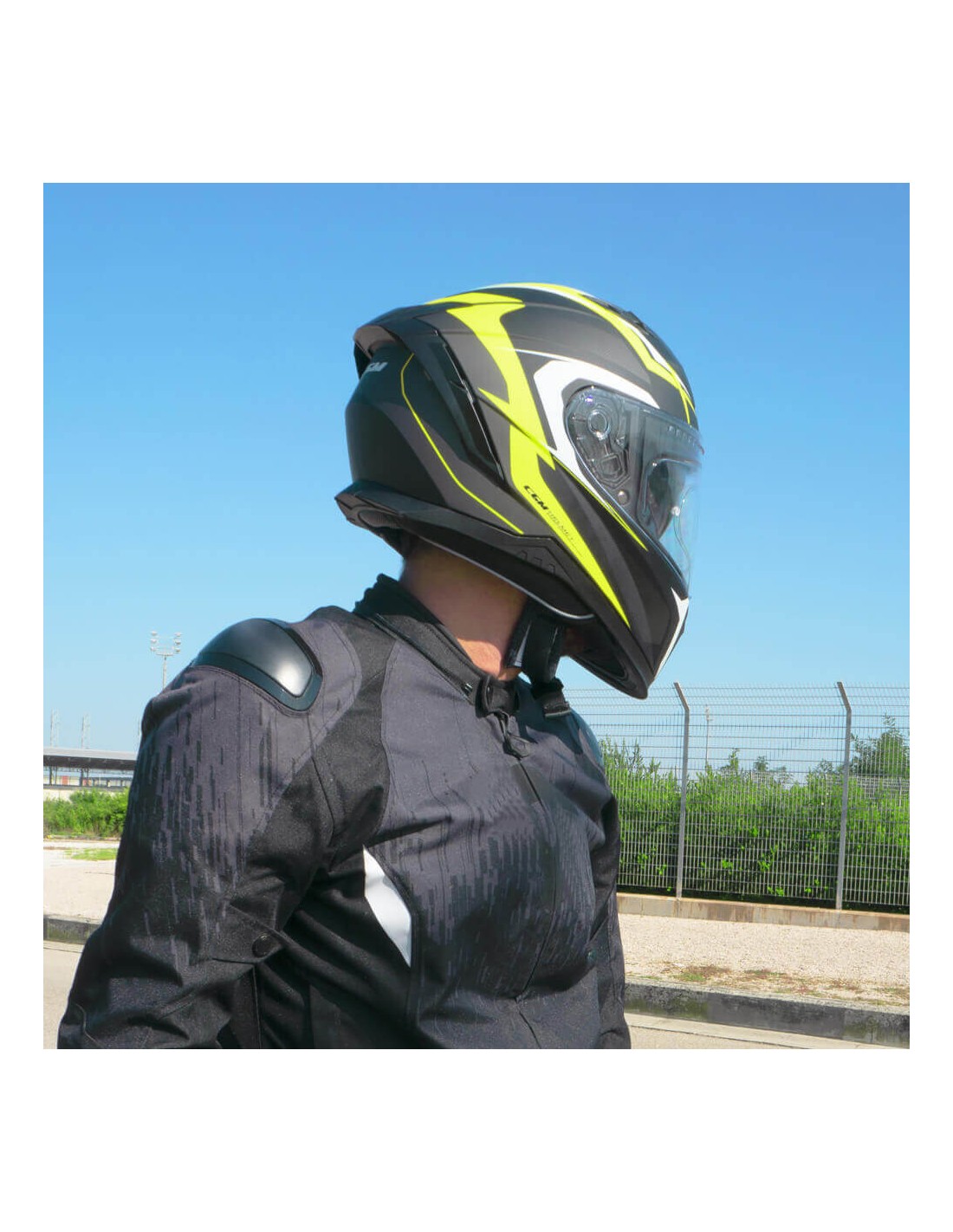 Realizzato con calotta in HPT (High Performance Terpolymer) dispone di visiera esterna basculante a sgancio rapido e visiera parasole interna a scomparsa. Il sistema di aerazione a quattro zone, con canalizzazione interna, è caratterizzato da una imponente presa d'aria sulla mentoniera. Gli interni dalla tessitura ExtraCool sono dotati di bande alta visibilità esterne per aumentare la sicurezza passiva e di deflettore paranaso e deflettore coprimento per aumentare la resistenza al vento e la silenziosità. Inclusa nella confezione una lente antiappannamento FogCity Go - Flexible Seal. Completano le dotazioni del modello la predisposizione per alloggiare un sistema di comunicazione aftermarket, la fibbia micrometrica e l'elastico fermacinturino.