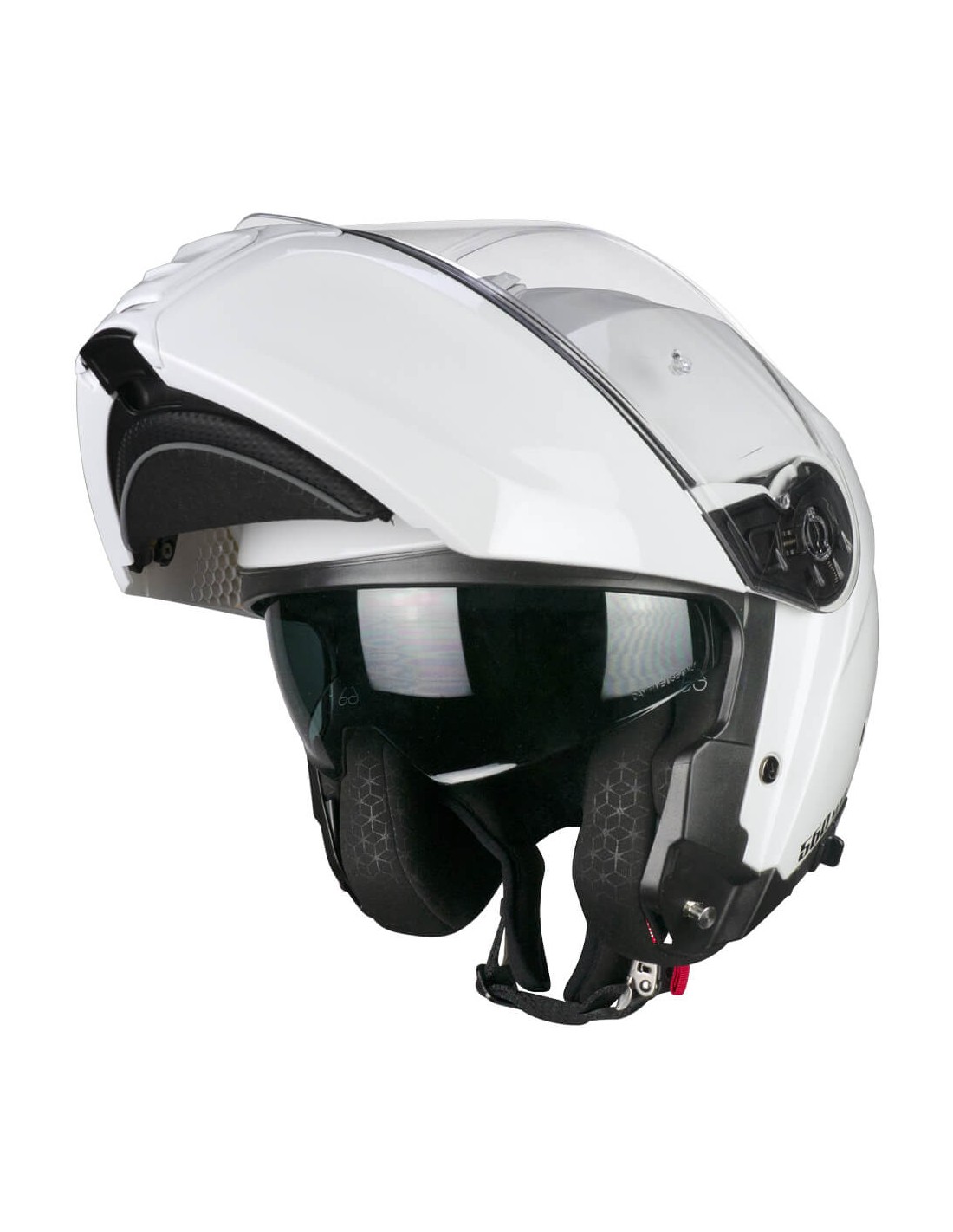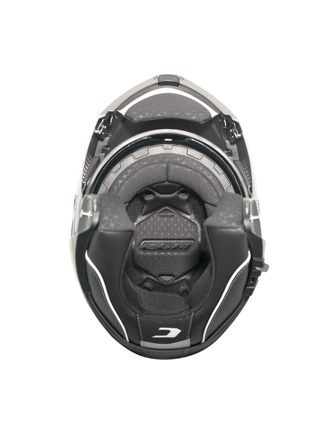 Gli interni del casco removibili, termoformati esagonali per un miglior comfort di calzata, sono realizzati con tessuto ExtraCool e dotati di bande alta visibilità. L'imbottitura interna è realizzata con un apposito alloggio per le aste degli occhiali e con predisposizione per interfono. I deflettori comprimento e coprinuca impediscono all'aria di entrare nel casco aumentandone stabilità e silenziosità. Completano le dotazioni il deflettore paranaso, la fibbia micrometrica in metallo e l'elastico fermacinturino. CARBON: peso medio calotta piccola 1450gr, peso medio calotta grande 1500gr. HD COMPOSITE FIBERGLASS: peso medio calotta piccola 1500gr, peso medio calotta grande 1550gr.