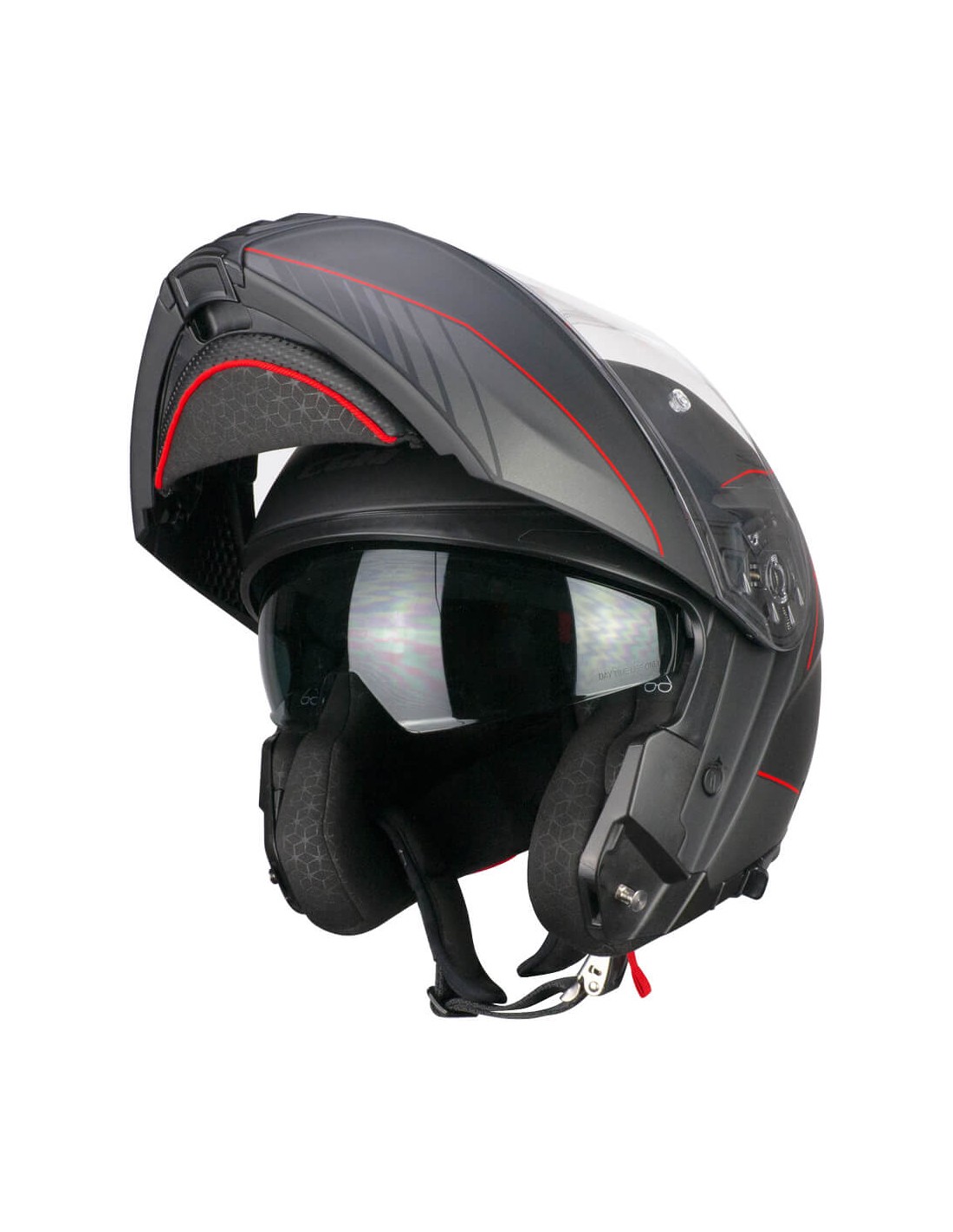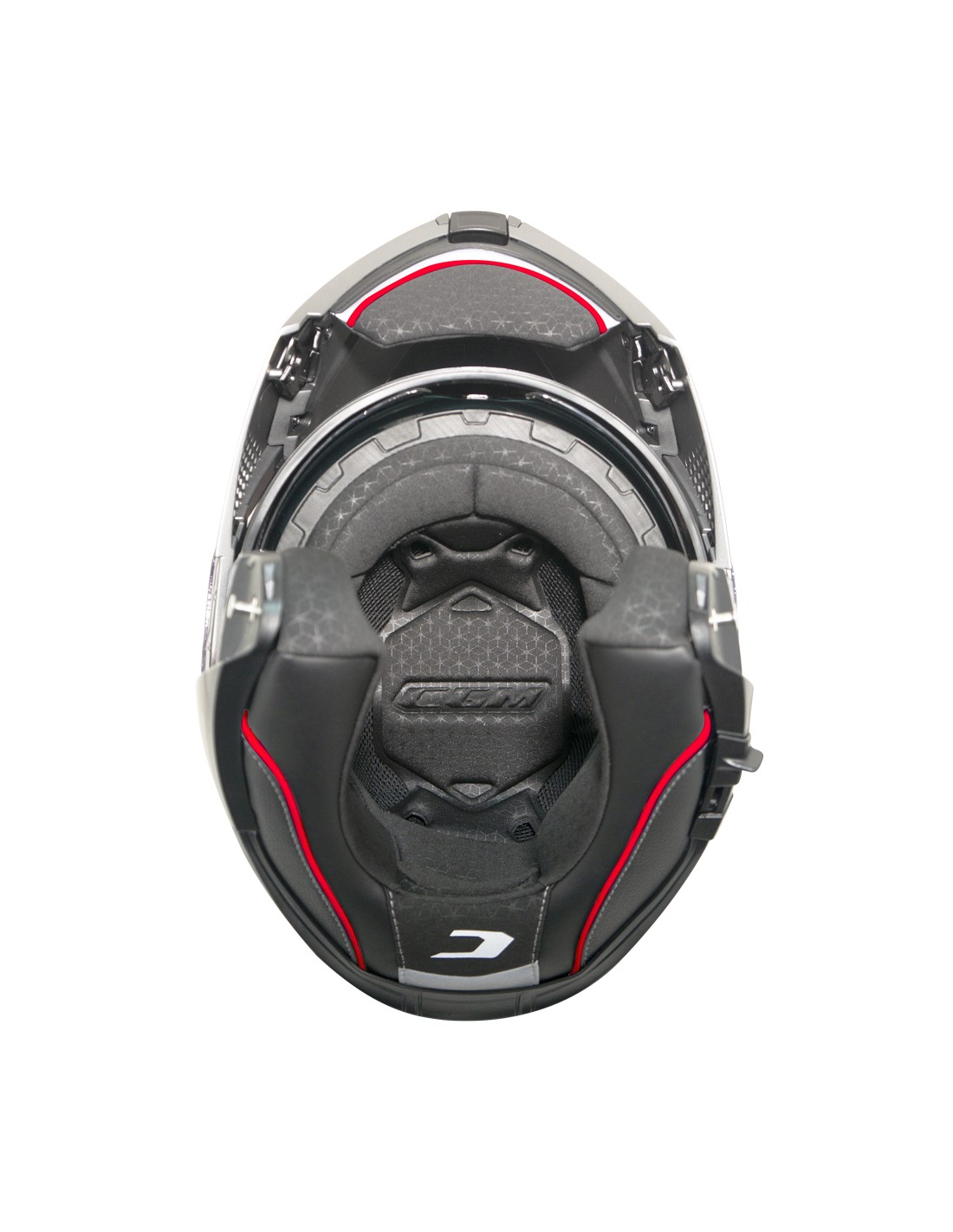 Gli interni del casco removibili, termoformati esagonali per un miglior comfort di calzata, sono realizzati con tessuto ExtraCool e dotati di bande alta visibilità. L'imbottitura interna è realizzata con un apposito alloggio per le aste degli occhiali e con predisposizione per interfono. I deflettori comprimento e coprinuca impediscono all'aria di entrare nel casco aumentandone stabilità e silenziosità. Completano le dotazioni il deflettore paranaso, la fibbia micrometrica in metallo e l'elastico fermacinturino. CARBON: peso medio calotta piccola 1450gr, peso medio calotta grande 1500gr. HD COMPOSITE FIBERGLASS: peso medio calotta piccola 1500gr, peso medio calotta grande 1550gr.