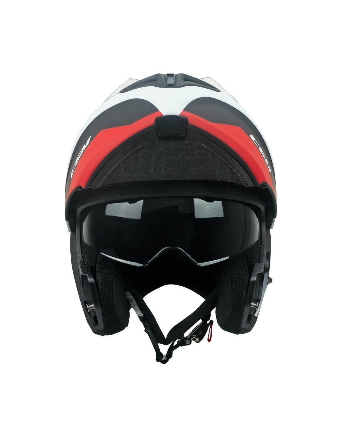 La visiera esterna basculante, a sgancio rapido e con blocco in posizione chiusa è predisposta Pinlock 70 mentre la visiera interna parasole a scomparsa aiuta il pilota a adattarsi a differenti condizioni di luminosità. Il set di interni termoformati esagonali è realizzato con tessuto extracool, prevede un apposito alloggio per le aste degli occhiali. La predisposizione interfono di questo modello è caratterizzata da un alloggio per il corpo auricolare e un sostegno per l'asta del microfono. La fibbia micrometrica e l'elastico tricolore fermacinturino completano le equipaggiamenti di fascia alta del casco.