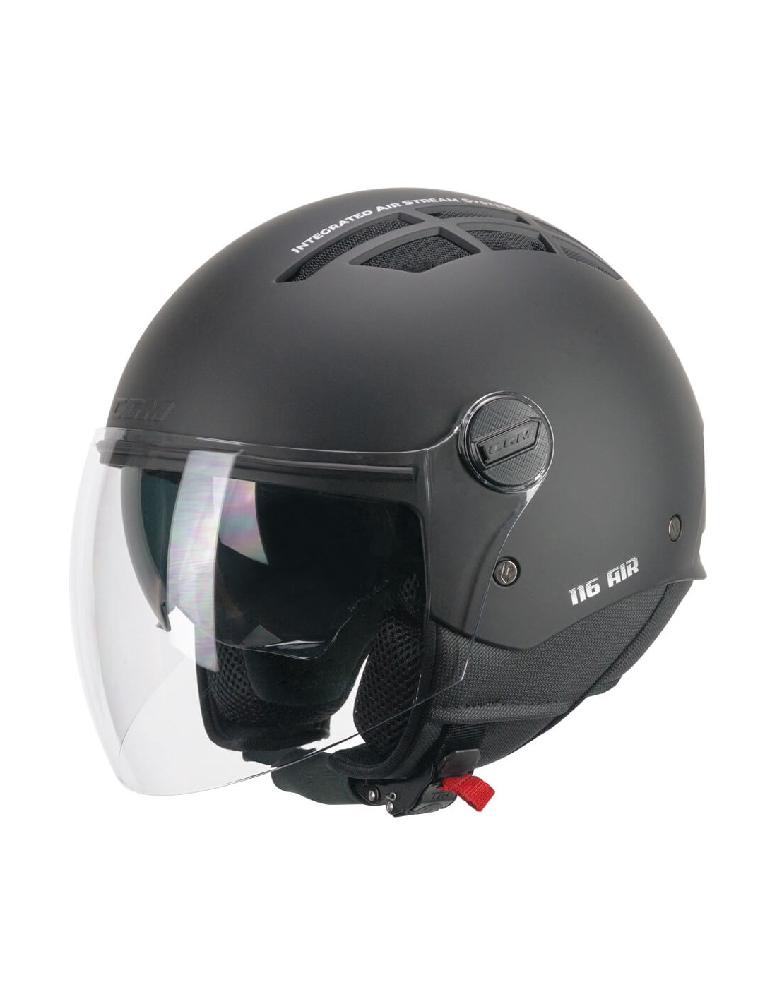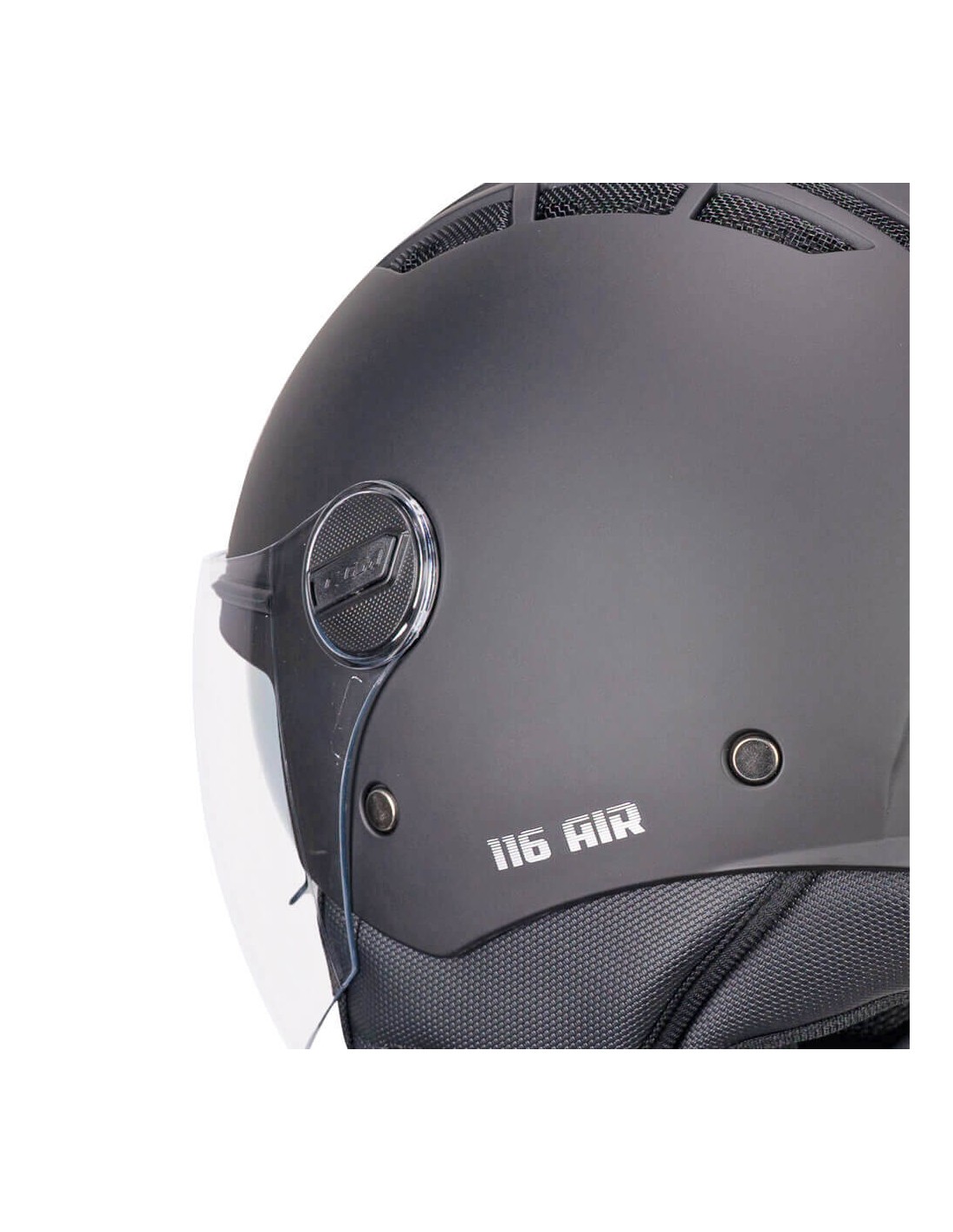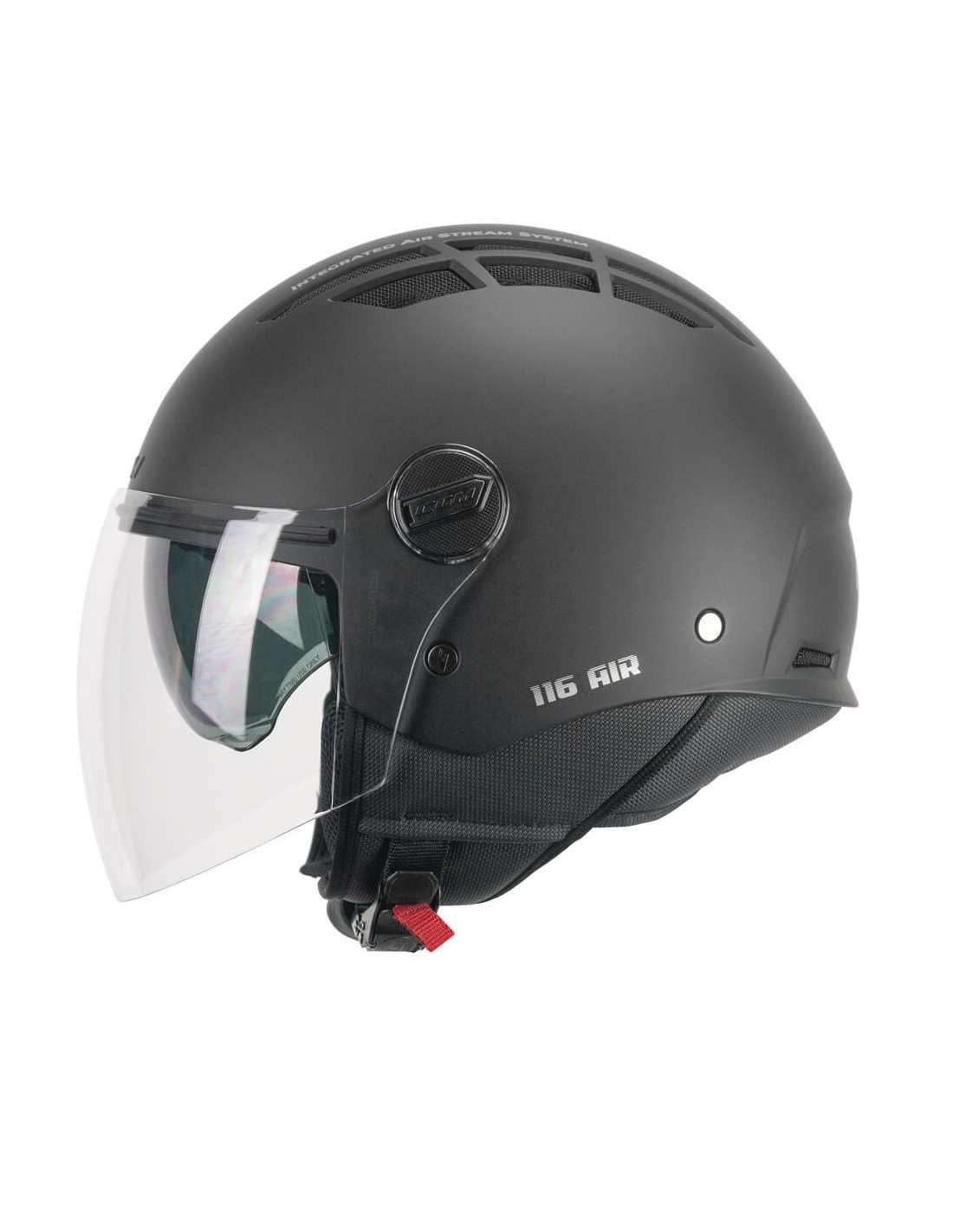 Il casco 4 stagioni, è ideale per affrontare le stagioni più calde grazie alle grandi feritoie in calotta che garantiscono il riciclo d'aria all'interno del casco e allo stesso tempo valido anche in condizioni avverse grazie alla visiera esterna lunga e alle apposite cover per le feritoie fornite in dotazione. Il 116 AIR è realizzato in due misure di calotta esterna in HPT (High Performance Terpolymer) e con quattro calotte interne in EPS multidensità. Dispone inoltre di visiera interna parasole a scomparsa, interni termoformati, guanciali e sottomento realizzati con tessuto antiallergico e antibatterico facilmente removibili e lavabili. Completano le dotazioni la fibbia micrometrica, l'anello antifurto al cinturino e l'elastico fermacinturino.