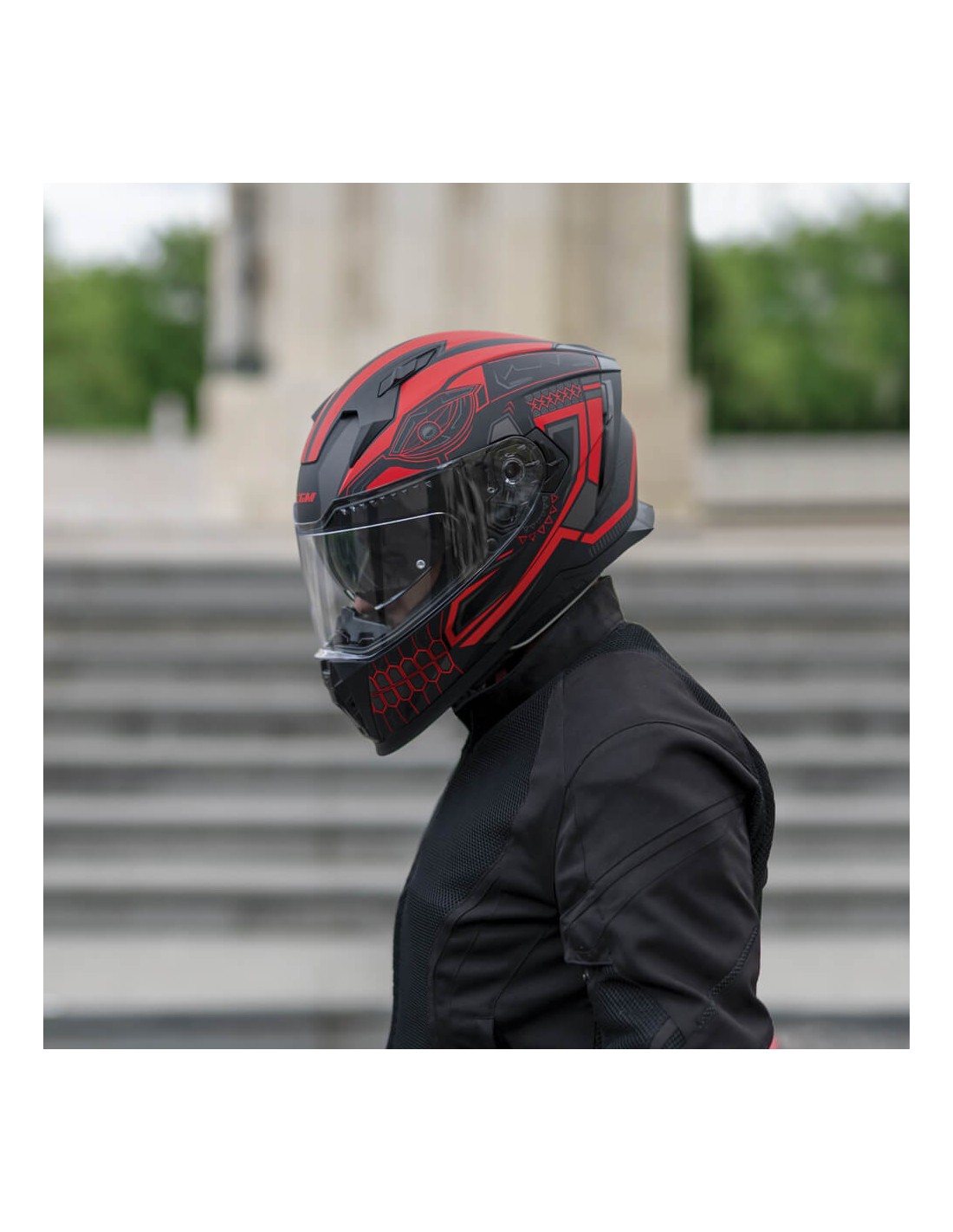 Realizzato con calotta in HPT (High Performance Terpolymer) dispone di visiera esterna basculante a sgancio rapido e visiera parasole interna a scomparsa. Il sistema di aerazione a quattro zone, con canalizzazione interna, è caratterizzato da una imponente presa d'aria sulla mentoniera. Gli interni dalla tessitura ExtraCool sono dotati di bande alta visibilità esterne per aumentare la sicurezza passiva e di deflettore paranaso e deflettore coprimento per aumentare la resistenza al vento e la silenziosità. Inclusa nella confezione una lente antiappannamento FogCity Go - Flexible Seal. Completano le dotazioni del modello la predisposizione per alloggiare un sistema di comunicazione aftermarket, la fibbia micrometrica e l'elastico fermacinturino.