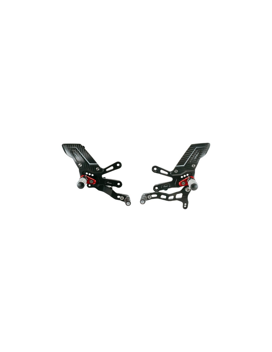 Sono regolabili in altezza e in arretramento offrendo molteplici posizionamenti del poggiapiede, implementabili con ausilio di pastrine supporto poggiapiede opzionali. Nelle leve sono integrati fino a 3 cuscinetti di alta qualità per poter sopportare le sollecitazioni più estreme su strada, ma soprattutto su pista. Le pedane possono essere personalizzate grazie ad una vasta gamma di accessori e ricambi.