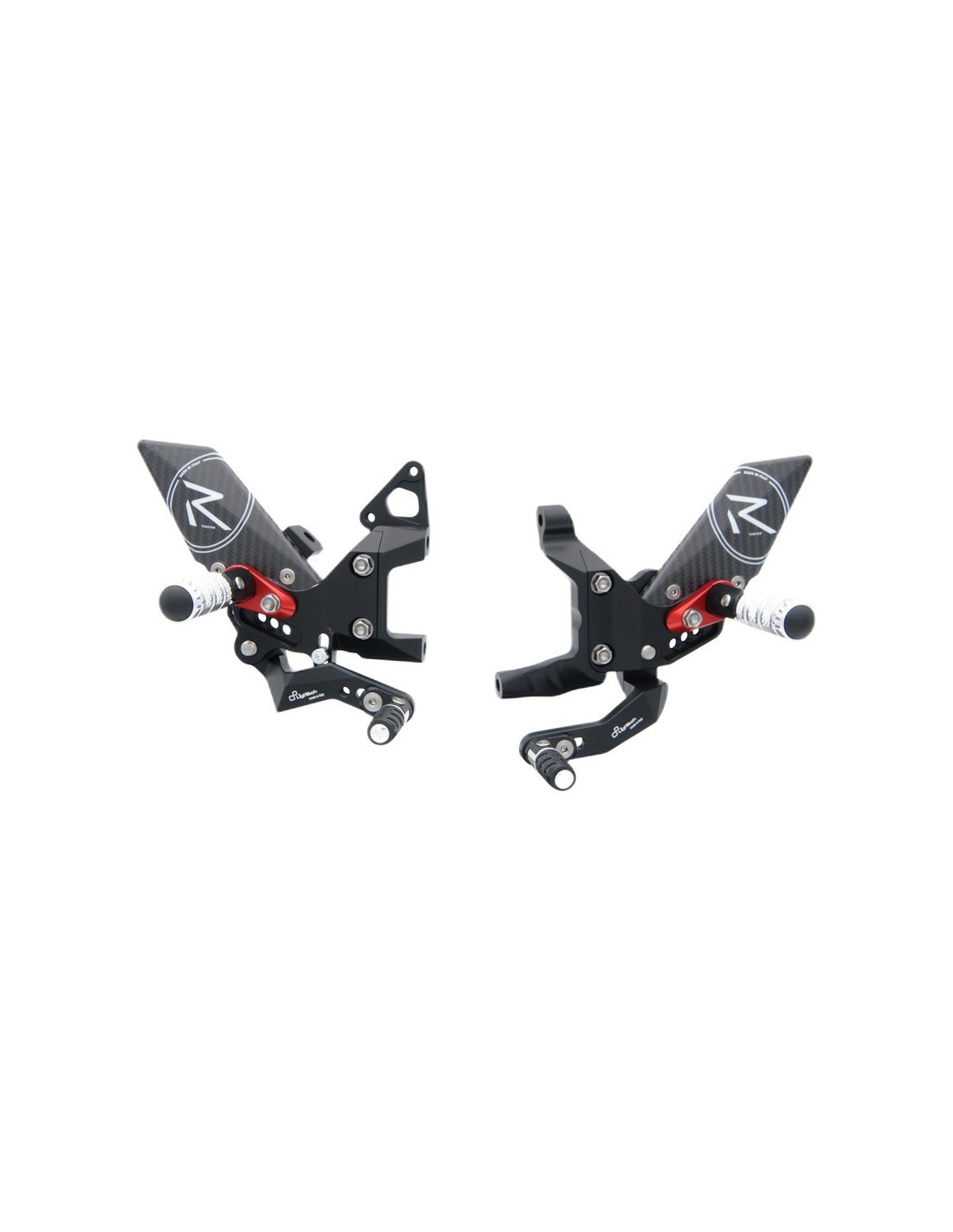 Sono regolabili in altezza e in arretramento offrendo molteplici posizionamenti del poggiapiede, implementabili con ausilio di pastrine supporto poggiapiede opzionali. Nelle leve sono integrati fino a 3 cuscinetti di alta qualità per poter sopportare le sollecitazioni più estreme su strada, ma soprattutto su pista. Le pedane possono essere personalizzate grazie ad una vasta gamma di accessori e ricambi.