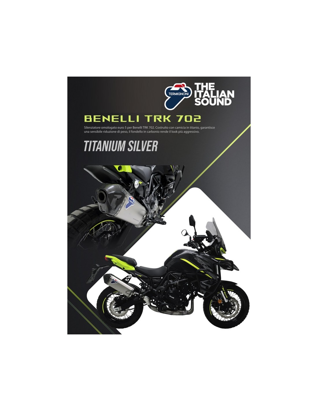 Silenziatore omologato euro5 per Benelli TRK702. Costruito con camicia in titanio,garantisce